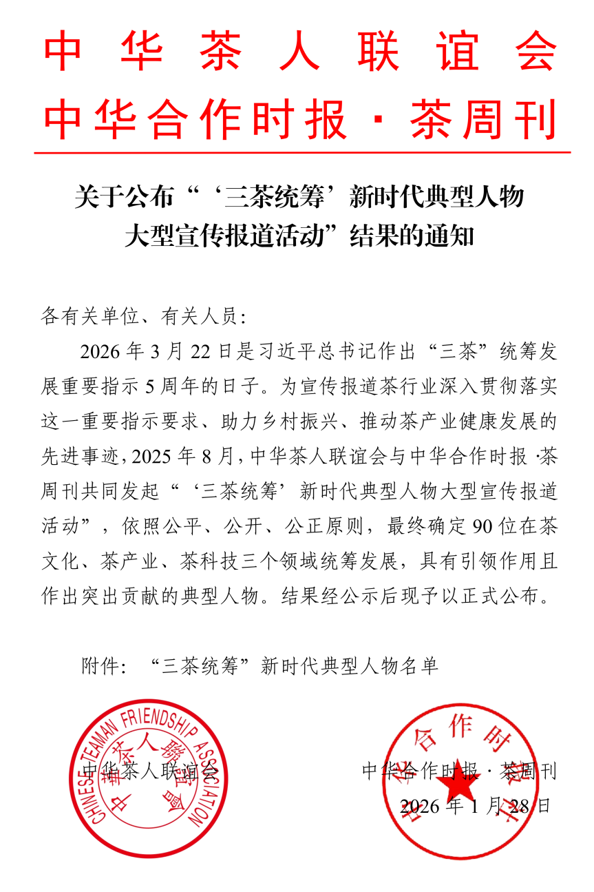 近日,由中华茶人联谊会与中华合作时报·茶周刊共同主办的 “‘三茶统筹’新时代典型人物大型宣传报道活动” 评选结果正式揭晓。公司总经理余智勇,凭借其在推动茯茶产业高质量发展、深入践行“三茶统筹”发展理念方面的突出贡献,光荣入选。